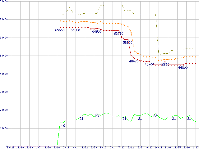※このグラフは過去のデータも税率5%相当に調整した税込み相当額のグラフです。 税率変更や、総額表示方式導入(2004年4月)の影響は除いています。 | | | ●凡例 | 最安値 (点線部は販売店未確認 または未調査) | 平均値 | 最高値 | ショップ数 |