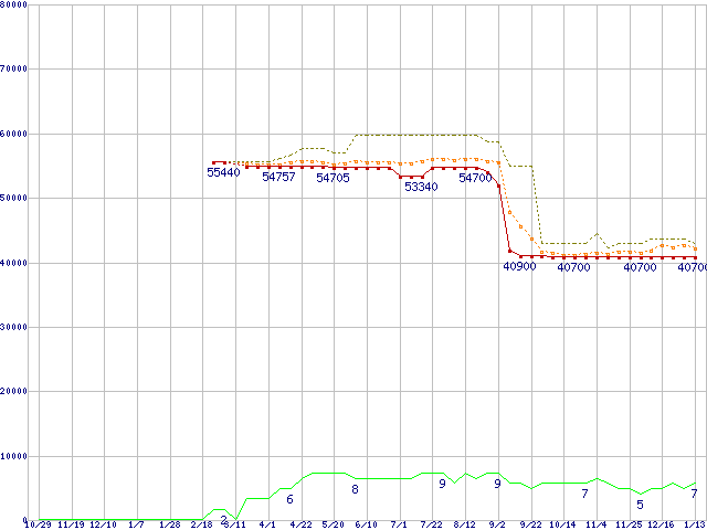 ※このグラフは過去のデータも税率5%相当に調整した税込み相当額のグラフです。 税率変更や、総額表示方式導入(2004年4月)の影響は除いています。 | | | ●凡例 | 最安値 (点線部は販売店未確認 または未調査) | 平均値 | 最高値 | ショップ数 |