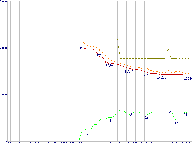 ※このグラフは過去のデータも税率5%相当に調整した税込み相当額のグラフです。 税率変更や、総額表示方式導入(2004年4月)の影響は除いています。 | | | ●凡例 | 最安値 (点線部は販売店未確認 または未調査) | 平均値 | 最高値 | ショップ数 |
