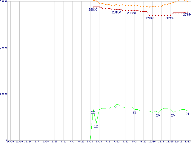 ※このグラフは過去のデータも税率5%相当に調整した税込み相当額のグラフです。 税率変更や、総額表示方式導入(2004年4月)の影響は除いています。 | | | ●凡例 | 最安値 (点線部は販売店未確認 または未調査) | 平均値 | 最高値 | ショップ数 |