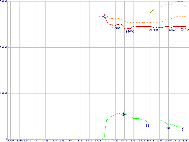 ※このグラフは過去のデータも税率5%相当に調整した税込み相当額のグラフです。 税率変更や、総額表示方式導入(2004年4月)の影響は除いています。 | | | ●凡例 | 最安値 (点線部は販売店未確認 または未調査) | 平均値 | 最高値 | ショップ数 |