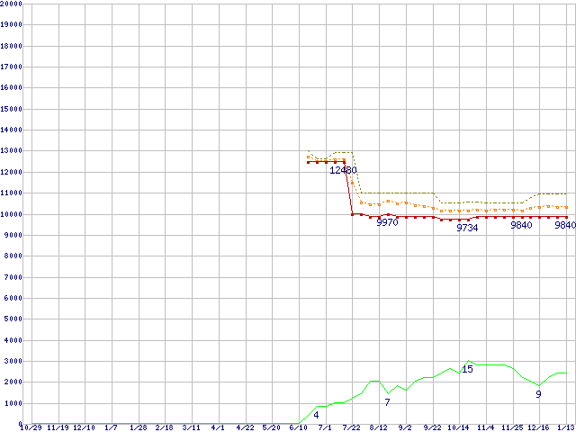 ※このグラフは過去のデータも税率5%相当に調整した税込み相当額のグラフです。 税率変更や、総額表示方式導入(2004年4月)の影響は除いています。 | | | ●凡例 | 最安値 (点線部は販売店未確認 または未調査) | 平均値 | 最高値 | ショップ数 |