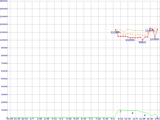 ※このグラフは過去のデータも税率5%相当に調整した税込み相当額のグラフです。 税率変更や、総額表示方式導入(2004年4月)の影響は除いています。 | | | ●凡例 | 最安値 (点線部は販売店未確認 または未調査) | 平均値 | 最高値 | ショップ数 |