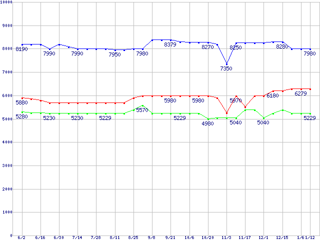 | Barracuda 7200.7 (7200rpm,Ultra ATA/100,2MB,80GB/Platter)の最安値推移 | | | (2005年6月2日~2006年1月12日) |