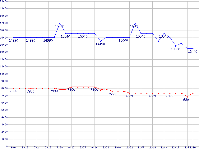 | PC3200(DDR400) DDR SDRAM DIMM ECC対応 Registeredタイプの最安値推移 | | | (2005年6月4日~2006年1月14日) |