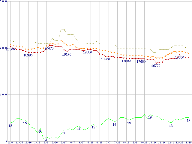 ※このグラフは過去のデータも税率5%相当に調整した税込み相当額のグラフです。 税率変更や、総額表示方式導入(2004年4月)の影響は除いています。 | | | ●凡例 | 最安値 (点線部は販売店未確認 または未調査) | 平均値 | 最高値 | ショップ数 |