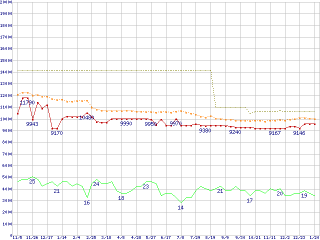 ※このグラフは過去のデータも税率5%相当に調整した税込み相当額のグラフです。 税率変更や、総額表示方式導入(2004年4月)の影響は除いています。 | | | ●凡例 | 最安値 (点線部は販売店未確認 または未調査) | 平均値 | 最高値 | ショップ数 |