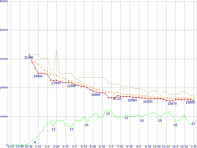※このグラフは過去のデータも税率5%相当に調整した税込み相当額のグラフです。 税率変更や、総額表示方式導入(2004年4月)の影響は除いています。 | | | ●凡例 | 最安値 (点線部は販売店未確認 または未調査) | 平均値 | 最高値 | ショップ数 |