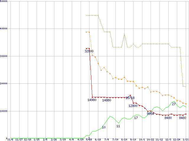 ※このグラフは過去のデータも税率5%相当に調整した税込み相当額のグラフです。 税率変更や、総額表示方式導入(2004年4月)の影響は除いています。 | | | ●凡例 | 最安値 (点線部は販売店未確認 または未調査) | 平均値 | 最高値 | ショップ数 |