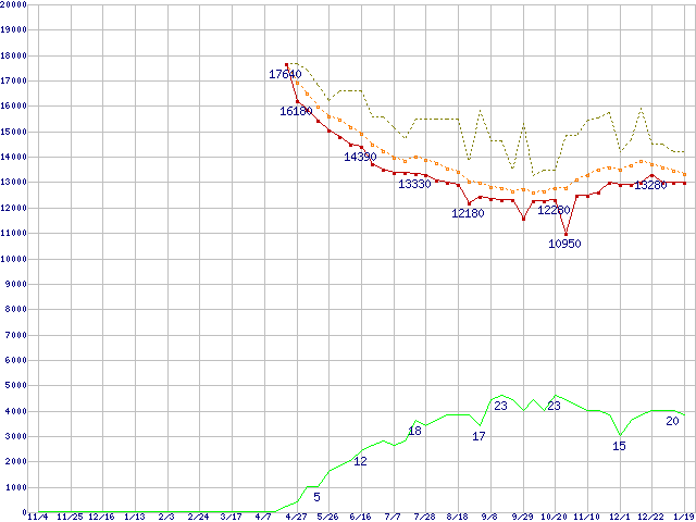 ※このグラフは過去のデータも税率5%相当に調整した税込み相当額のグラフです。 税率変更や、総額表示方式導入(2004年4月)の影響は除いています。 | | | ●凡例 | 最安値 (点線部は販売店未確認 または未調査) | 平均値 | 最高値 | ショップ数 |