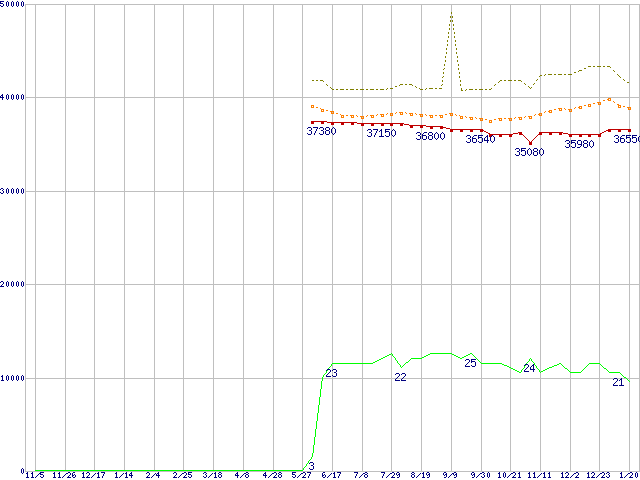 ※このグラフは過去のデータも税率5%相当に調整した税込み相当額のグラフです。 税率変更や、総額表示方式導入(2004年4月)の影響は除いています。 | | | ●凡例 | 最安値 (点線部は販売店未確認 または未調査) | 平均値 | 最高値 | ショップ数 |
