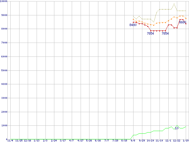 ※このグラフは過去のデータも税率5%相当に調整した税込み相当額のグラフです。 税率変更や、総額表示方式導入(2004年4月)の影響は除いています。 | | | ●凡例 | 最安値 (点線部は販売店未確認 または未調査) | 平均値 | 最高値 | ショップ数 |