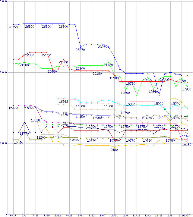 | CPU主要製品(最安値1万円~2万円未満)の最安値推移 | | | (2005年6月17日~2006年1月27日) |