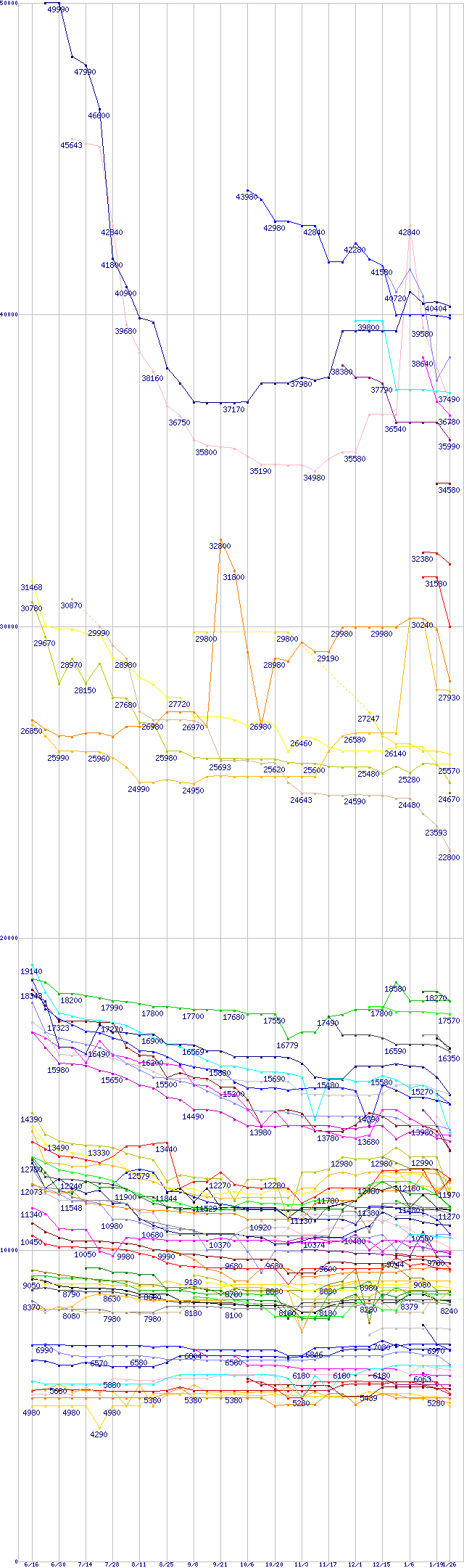 [前グラフ]:HDD主要製品(最安値2万円以上)の最安値推移
