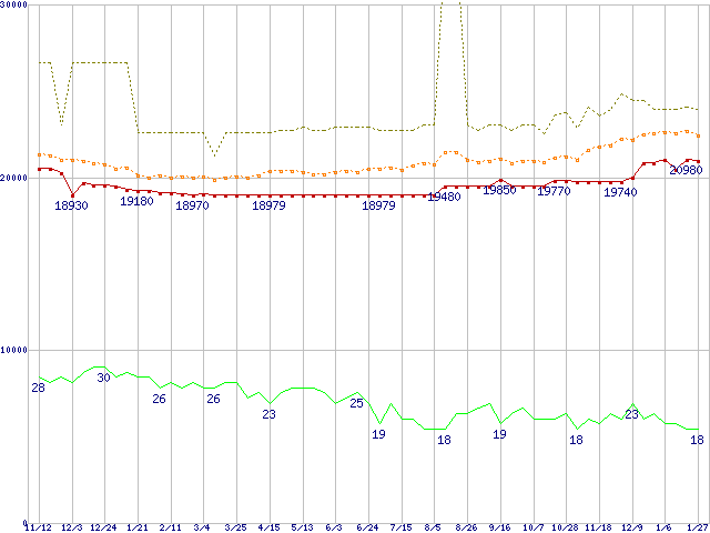 ※このグラフは過去のデータも税率5%相当に調整した税込み相当額のグラフです。 税率変更や、総額表示方式導入(2004年4月)の影響は除いています。 | | | ●凡例 | 最安値 (点線部は販売店未確認 または未調査) | 平均値 | 最高値 | ショップ数 |