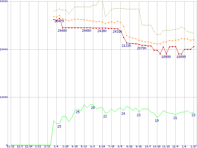 ※このグラフは過去のデータも税率5%相当に調整した税込み相当額のグラフです。 税率変更や、総額表示方式導入(2004年4月)の影響は除いています。 | | | ●凡例 | 最安値 (点線部は販売店未確認 または未調査) | 平均値 | 最高値 | ショップ数 |