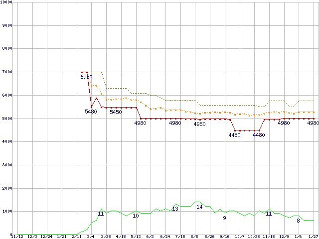 ※このグラフは過去のデータも税率5%相当に調整した税込み相当額のグラフです。 税率変更や、総額表示方式導入(2004年4月)の影響は除いています。 | | | ●凡例 | 最安値 (点線部は販売店未確認 または未調査) | 平均値 | 最高値 | ショップ数 |