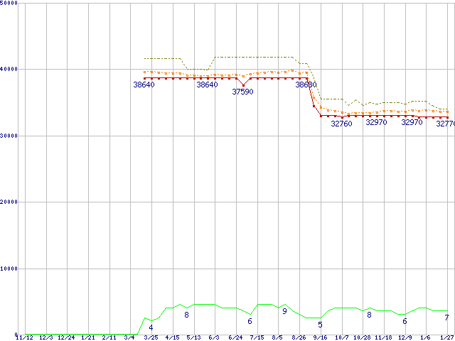 ※このグラフは過去のデータも税率5%相当に調整した税込み相当額のグラフです。 税率変更や、総額表示方式導入(2004年4月)の影響は除いています。 | | | ●凡例 | 最安値 (点線部は販売店未確認 または未調査) | 平均値 | 最高値 | ショップ数 |