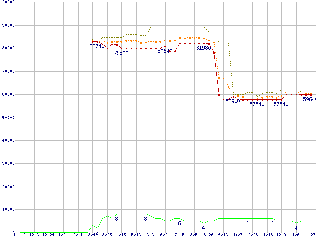 ※このグラフは過去のデータも税率5%相当に調整した税込み相当額のグラフです。 税率変更や、総額表示方式導入(2004年4月)の影響は除いています。 | | | ●凡例 | 最安値 (点線部は販売店未確認 または未調査) | 平均値 | 最高値 | ショップ数 |