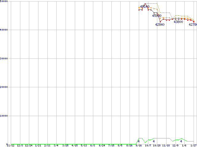 ※このグラフは過去のデータも税率5%相当に調整した税込み相当額のグラフです。 税率変更や、総額表示方式導入(2004年4月)の影響は除いています。 | | | ●凡例 | 最安値 (点線部は販売店未確認 または未調査) | 平均値 | 最高値 | ショップ数 |