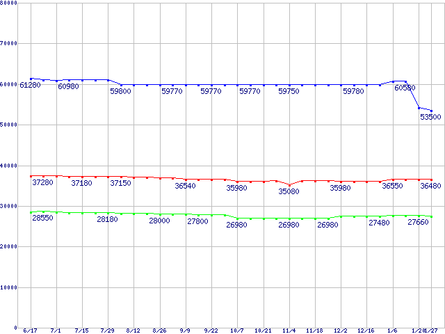 | LGA 775 (FSB 800MHz,L2 1MB×2,Dual Core,EM64T対応)の最安値推移 | | | (2005年6月17日~2006年1月27日) |