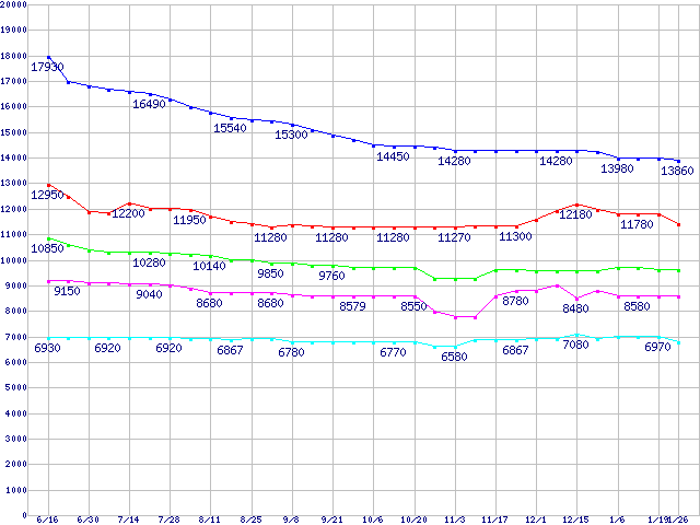 | DiamondMax 10 (7200rpm,Serial ATA II Phase1,RoHS指令準拠)の最安値推移 | | | (2005年6月16日~2006年1月26日) |