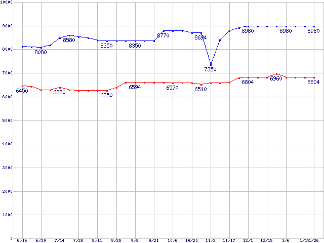 | Barracuda 7200.7 SATA (7200rpm,Serial ATA,NCQ,8MB,80GB/Platter)の最安値推移 | | | (2005年6月16日~2006年1月26日) |