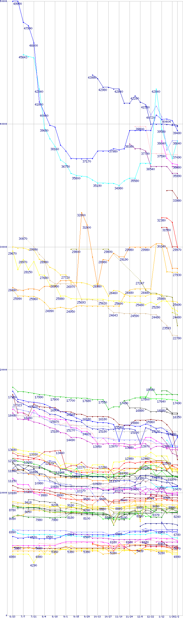 [前グラフ]:HDD主要製品(最安値2万円以上)の最安値推移