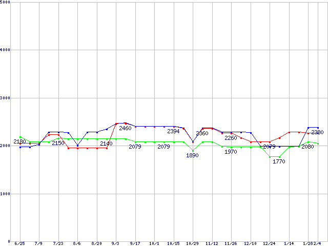 メモリ主要製品(最安値5千円未満)の最安値推移
