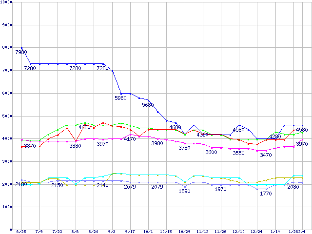 メモリ主要製品(最安値5千円~1万円未満)の最安値推移