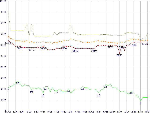 ※このグラフは過去のデータも税率5%相当に調整した税込み相当額のグラフです。 税率変更や、総額表示方式導入(2004年4月)の影響は除いています。 | | | ●凡例 | 最安値 (点線部は販売店未確認 または未調査) | 平均値 | 最高値 | ショップ数 |