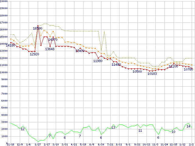 ※このグラフは過去のデータも税率5%相当に調整した税込み相当額のグラフです。 税率変更や、総額表示方式導入(2004年4月)の影響は除いています。 | | | ●凡例 | 最安値 (点線部は販売店未確認 または未調査) | 平均値 | 最高値 | ショップ数 |