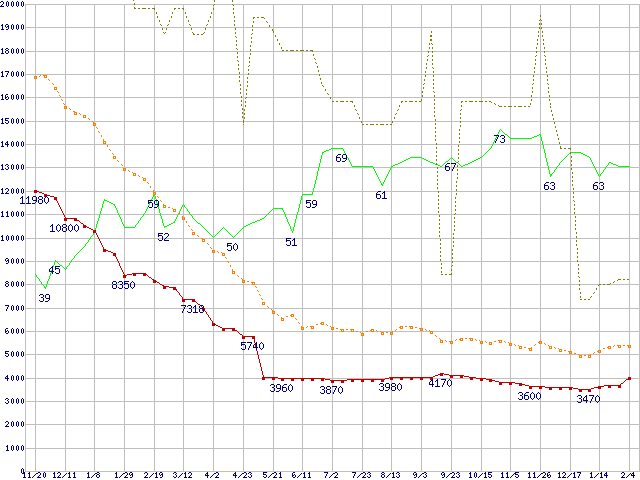 ※このグラフは過去のデータも税率5%相当に調整した税込み相当額のグラフです。 税率変更や、総額表示方式導入(2004年4月)の影響は除いています。 | | | ●凡例 | 最安値 (点線部は販売店未確認 または未調査) | 平均値 | 最高値 | ショップ数 |