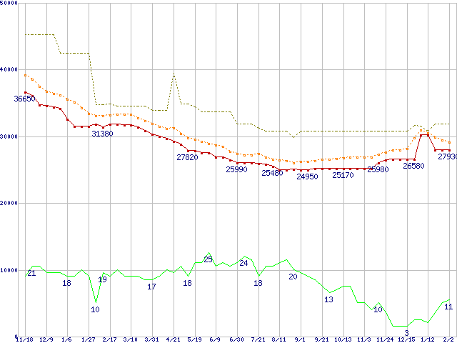 ※このグラフは過去のデータも税率5%相当に調整した税込み相当額のグラフです。 税率変更や、総額表示方式導入(2004年4月)の影響は除いています。 | | | ●凡例 | 最安値 (点線部は販売店未確認 または未調査) | 平均値 | 最高値 | ショップ数 |