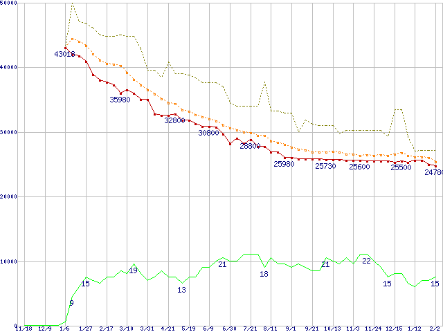 ※このグラフは過去のデータも税率5%相当に調整した税込み相当額のグラフです。 税率変更や、総額表示方式導入(2004年4月)の影響は除いています。 | | | ●凡例 | 最安値 (点線部は販売店未確認 または未調査) | 平均値 | 最高値 | ショップ数 |