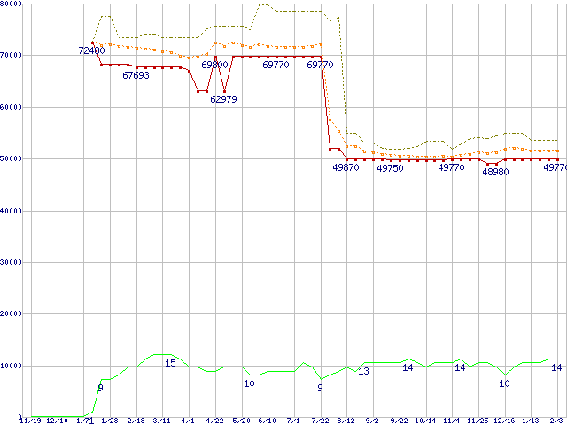 ※このグラフは過去のデータも税率5%相当に調整した税込み相当額のグラフです。 税率変更や、総額表示方式導入(2004年4月)の影響は除いています。 | | | ●凡例 | 最安値 (点線部は販売店未確認 または未調査) | 平均値 | 最高値 | ショップ数 |