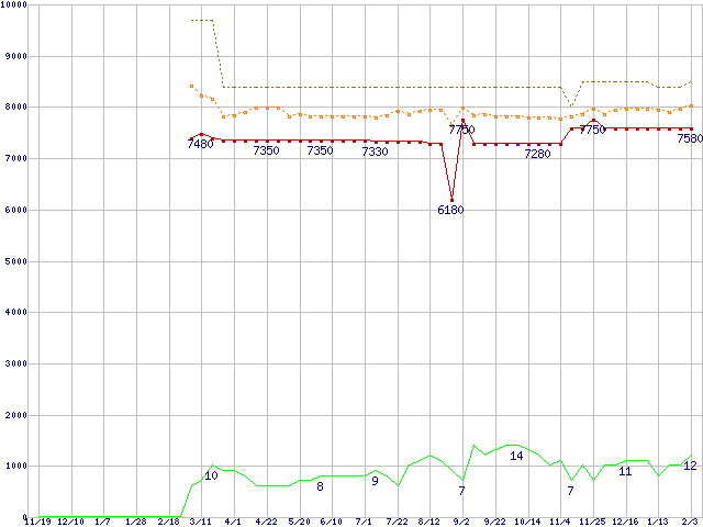 ※このグラフは過去のデータも税率5%相当に調整した税込み相当額のグラフです。 税率変更や、総額表示方式導入(2004年4月)の影響は除いています。 | | | ●凡例 | 最安値 (点線部は販売店未確認 または未調査) | 平均値 | 最高値 | ショップ数 |