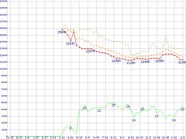 | HDT722525DLAT80 (250GB,8MB)の価格推移 | | | (2004年11月18日~2006年2月2日) |
