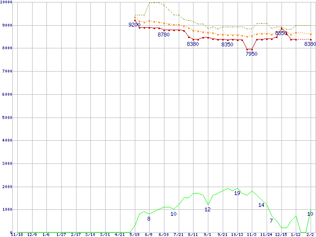 ※このグラフは過去のデータも税率5%相当に調整した税込み相当額のグラフです。 税率変更や、総額表示方式導入(2004年4月)の影響は除いています。 | | | ●凡例 | 最安値 (点線部は販売店未確認 または未調査) | 平均値 | 最高値 | ショップ数 |