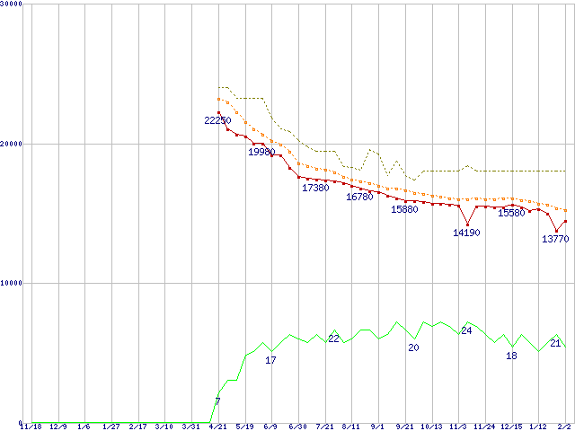 ※このグラフは過去のデータも税率5%相当に調整した税込み相当額のグラフです。 税率変更や、総額表示方式導入(2004年4月)の影響は除いています。 | | | ●凡例 | 最安値 (点線部は販売店未確認 または未調査) | 平均値 | 最高値 | ショップ数 |