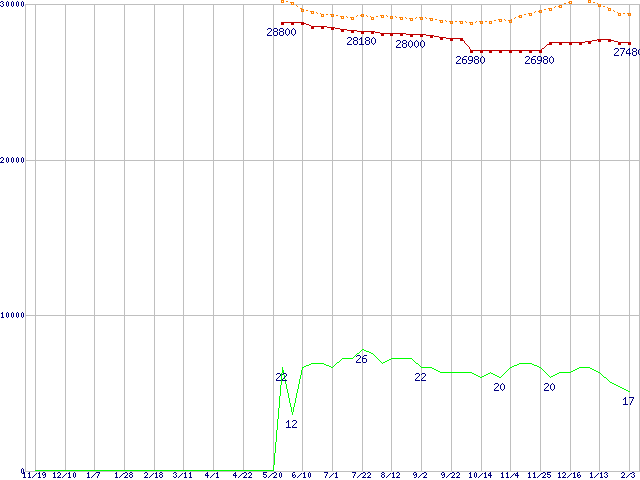 ※このグラフは過去のデータも税率5%相当に調整した税込み相当額のグラフです。 税率変更や、総額表示方式導入(2004年4月)の影響は除いています。 | | | ●凡例 | 最安値 (点線部は販売店未確認 または未調査) | 平均値 | 最高値 | ショップ数 |