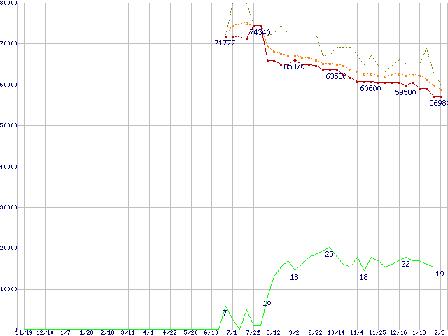 | Athlon 64 X2 4400+ (2.2GHz,L2 1MBx2)の価格推移 | | | (2004年11月19日~2006年2月3日) |