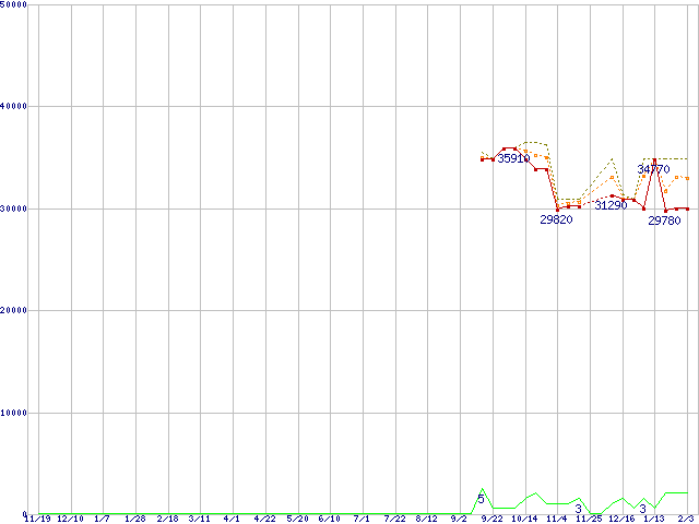 ※このグラフは過去のデータも税率5%相当に調整した税込み相当額のグラフです。 税率変更や、総額表示方式導入(2004年4月)の影響は除いています。 | | | ●凡例 | 最安値 (点線部は販売店未確認 または未調査) | 平均値 | 最高値 | ショップ数 |