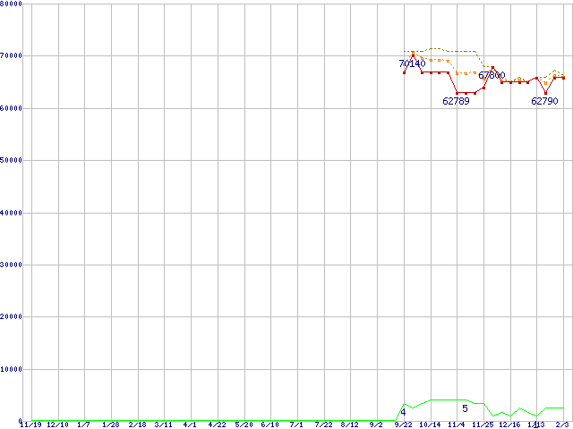 ※このグラフは過去のデータも税率5%相当に調整した税込み相当額のグラフです。 税率変更や、総額表示方式導入(2004年4月)の影響は除いています。 | | | ●凡例 | 最安値 (点線部は販売店未確認 または未調査) | 平均値 | 最高値 | ショップ数 |