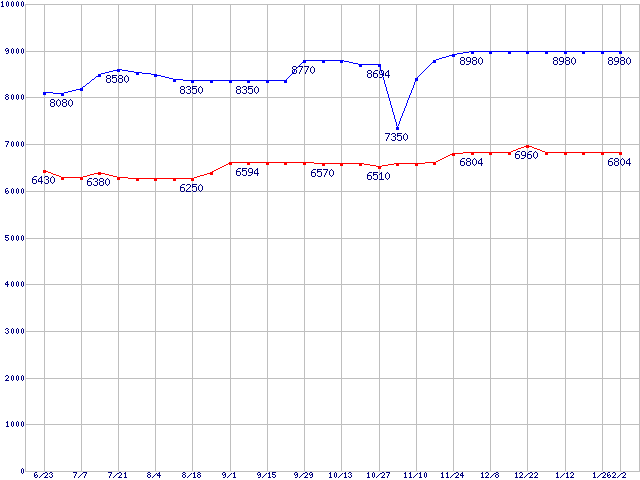 | Barracuda 7200.7 SATA (7200rpm,Serial ATA,NCQ,8MB,80GB/Platter)の最安値推移 | | | (2005年6月23日~2006年2月2日) |