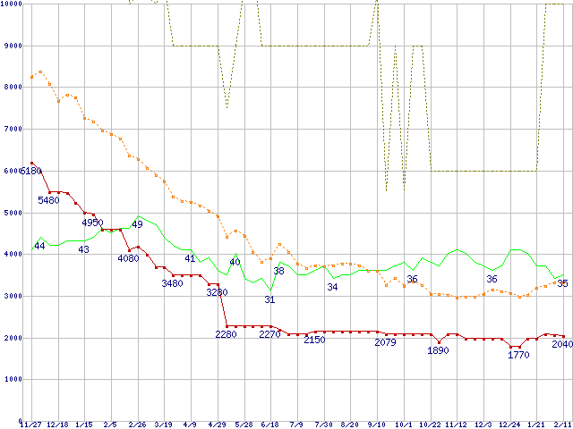 ※このグラフは過去のデータも税率5%相当に調整した税込み相当額のグラフです。 税率変更や、総額表示方式導入(2004年4月)の影響は除いています。 | | | ●凡例 | 最安値 (点線部は販売店未確認 または未調査) | 平均値 | 最高値 | ショップ数 |