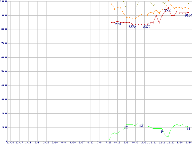 ※このグラフは過去のデータも税率5%相当に調整した税込み相当額のグラフです。 税率変更や、総額表示方式導入(2004年4月)の影響は除いています。 | | | ●凡例 | 最安値 (点線部は販売店未確認 または未調査) | 平均値 | 最高値 | ショップ数 |