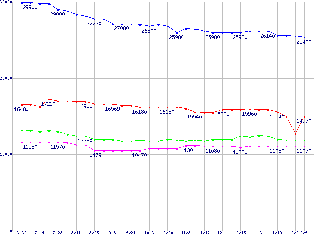 | Barracuda 7200.8 SATA (7200rpm,Serial ATA,NCQ,8MB,133GB/Platter)の最安値推移 | | | (2005年6月30日~2006年2月9日) |