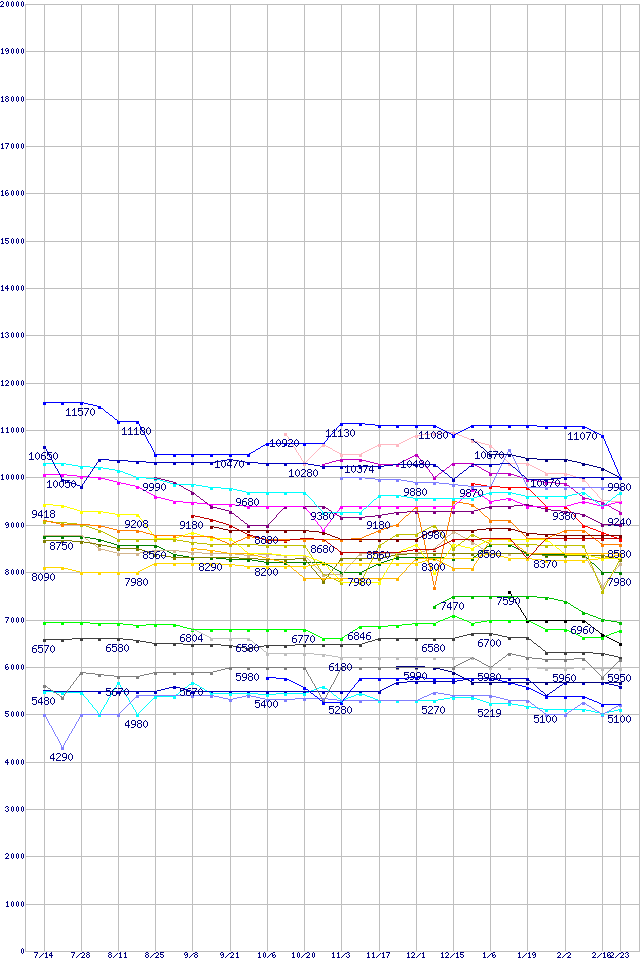 | HDD主要製品(最安値1万円未満)の最安値推移 | | | (2005年7月14日~2006年2月23日) |