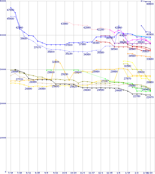 | HDD主要製品(最安値2万円以上)の最安値推移 | | | (2005年7月14日~2006年2月23日) |